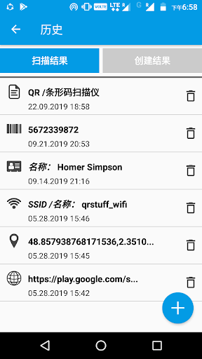 历史记录自动保存所有生成或扫描的QR码和条形码。