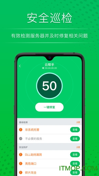 云帮手为您提供24小时不间断健康巡检、全面体检、系统一键加固、系统漏洞扫描一键修复,风险将无处可藏!