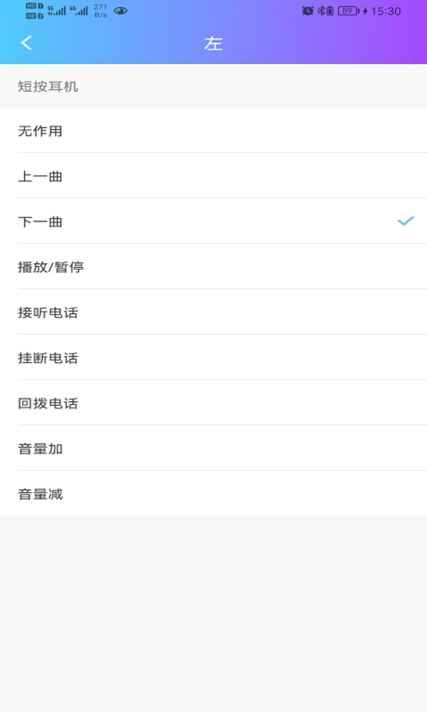 点击左耳或右耳的操作项,可自定义短按操作功能,包括切歌、调音量、接听电话等。