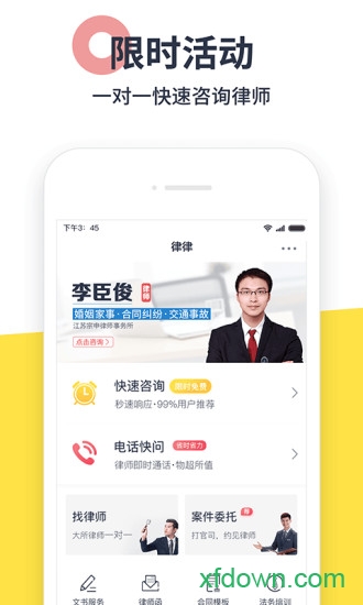 律律律师端app为用户提供快速咨询、一对一找律师、代写文书等服务;