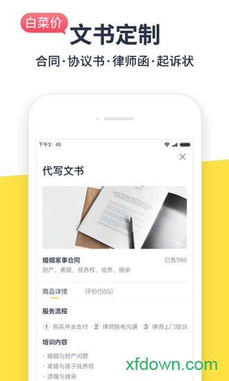 合同文书定制:涵盖婚姻类、房产类、借款买卖、股权激励方案等。定制流程简单贴心,从定务开始到结束,全程都可免费咨询法律顾问。