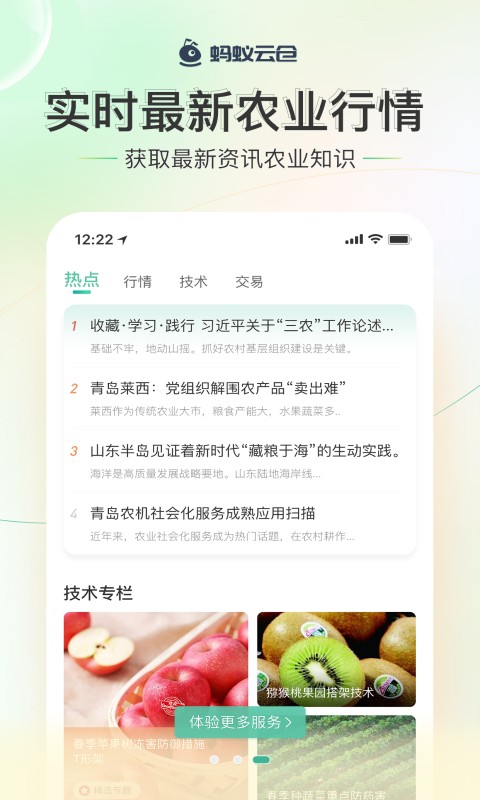 作为大宗农产品现货交易平台,蚂蚁云仓以仓储物流和结算服务为基础,依托云计算技术加速农产品流通,推动农业产业数字化转型,开辟农产品上行新渠道,助力乡村振兴战略实施。