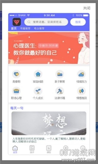 打开应用后,使用手机号完成注册流程。登录账号即可浏览首页最新心理健康资讯。选择适合的测评项目进行测试,或进入心理健康课程专区学习相关知识。