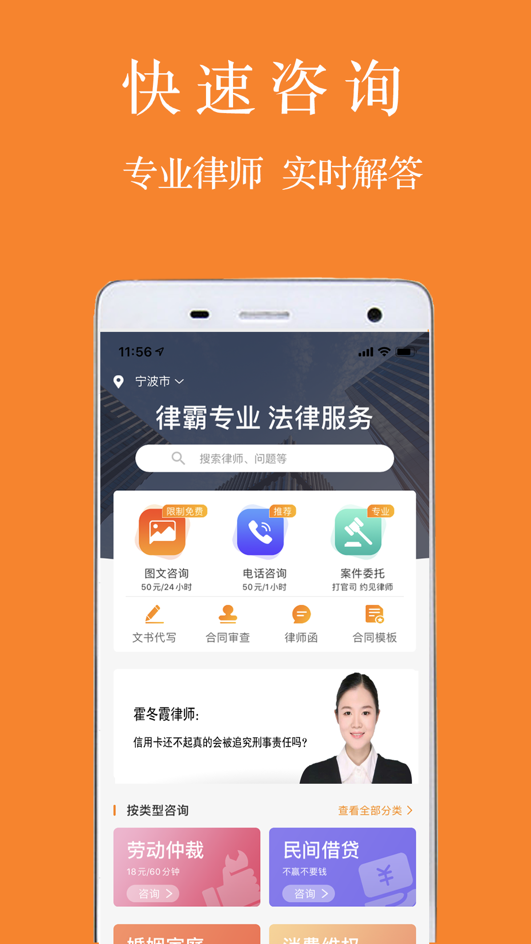 快速咨询、找律师、图文畅聊、电话咨询、打官司、文书代写、文书审核、律师函、预约律师……多种场景满足你的各种法律咨询!