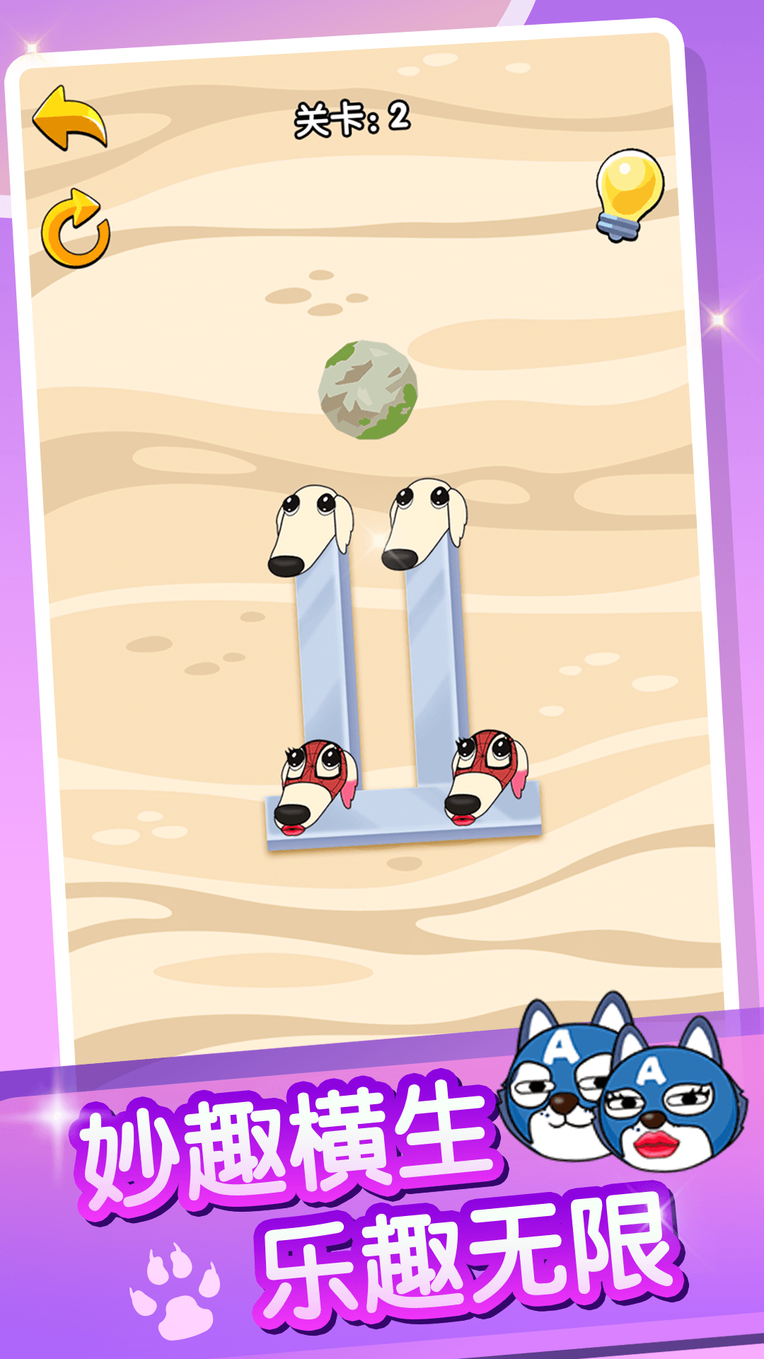 通过挖掘泥土通道,帮助可爱的狗蛋们找到彼此,完成甜蜜相聚。