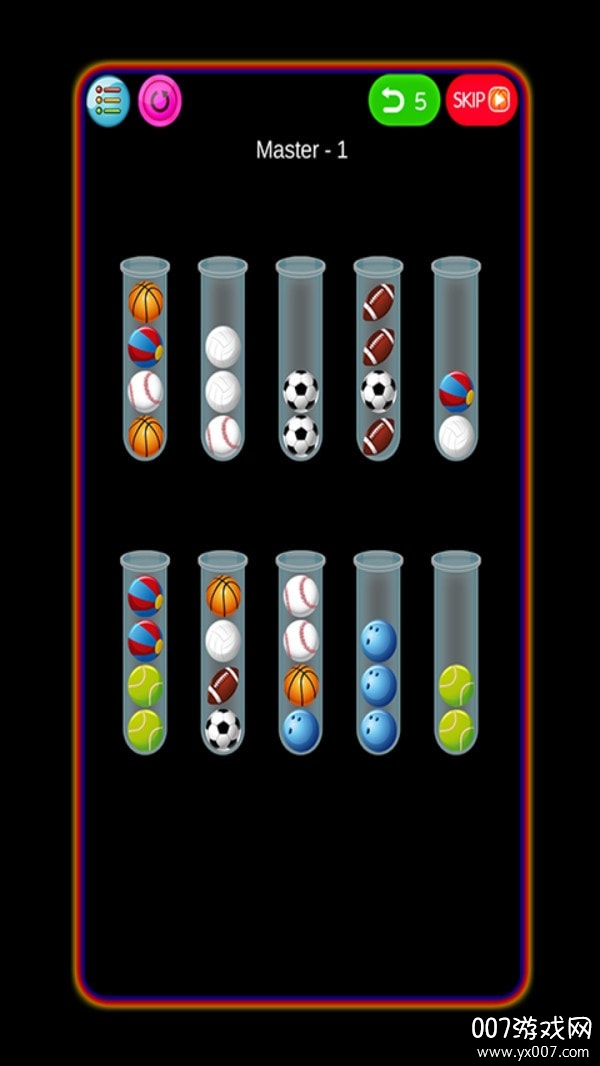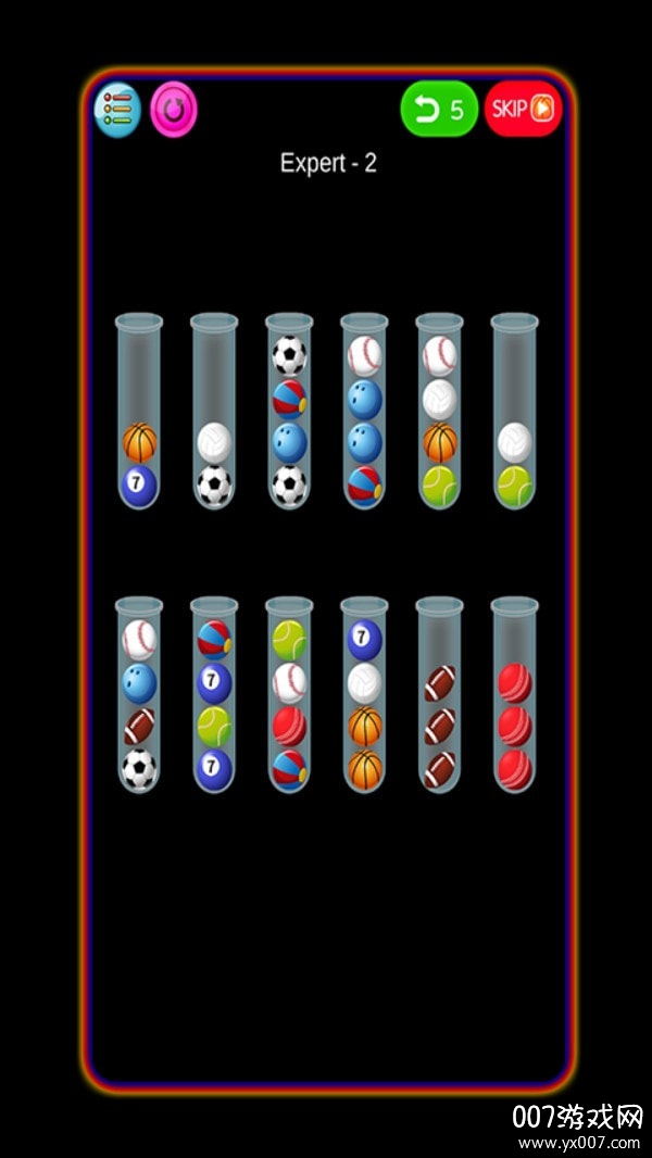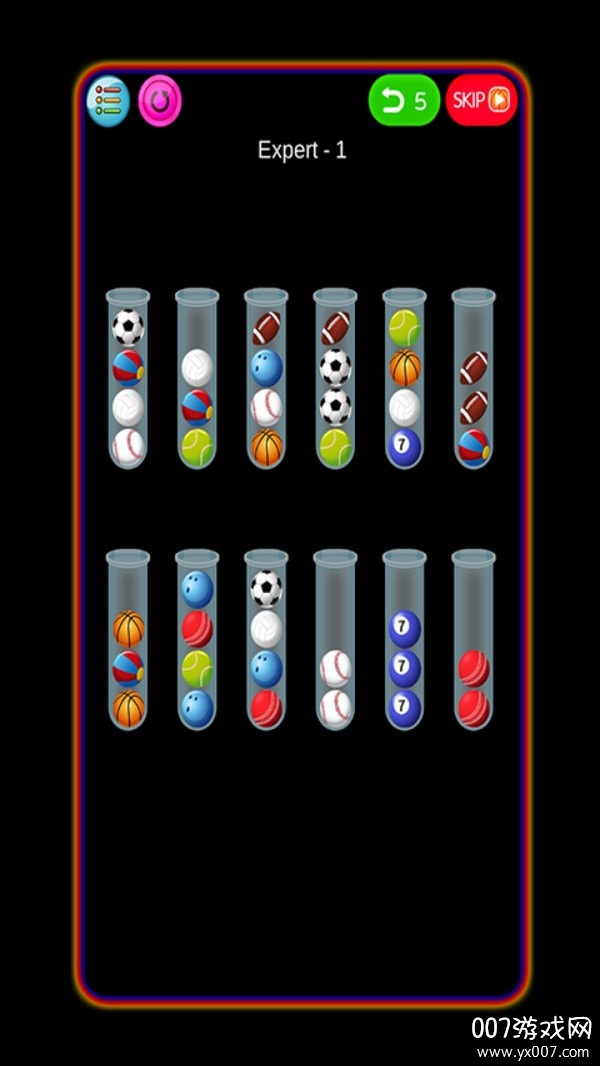 每个试管中必须装满相同颜色的小球才算过关,需要玩家仔细规划每一步操作;