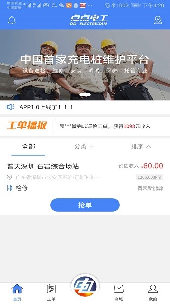 点点电工是国内领先的充电桩运维服务平台,为专业电工提供便捷的线上接单渠道。通过智能定位系统,电工可快速响应周边充电桩维修需求,每笔订单都清晰展示维修地点和报酬明细,支持随时提现,确保收益安全可靠。