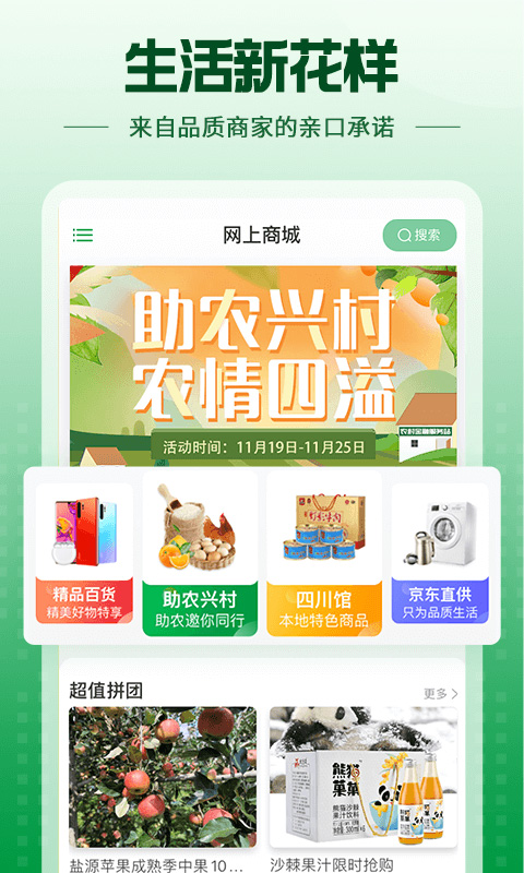 蜀信e·惠生活是四川农信专为社区居民设计的综合性服务平台,致力于为家庭生活提供优惠、便捷、诚信的消费体验,构建10分钟便民生活圈,全方位满足日常需求。