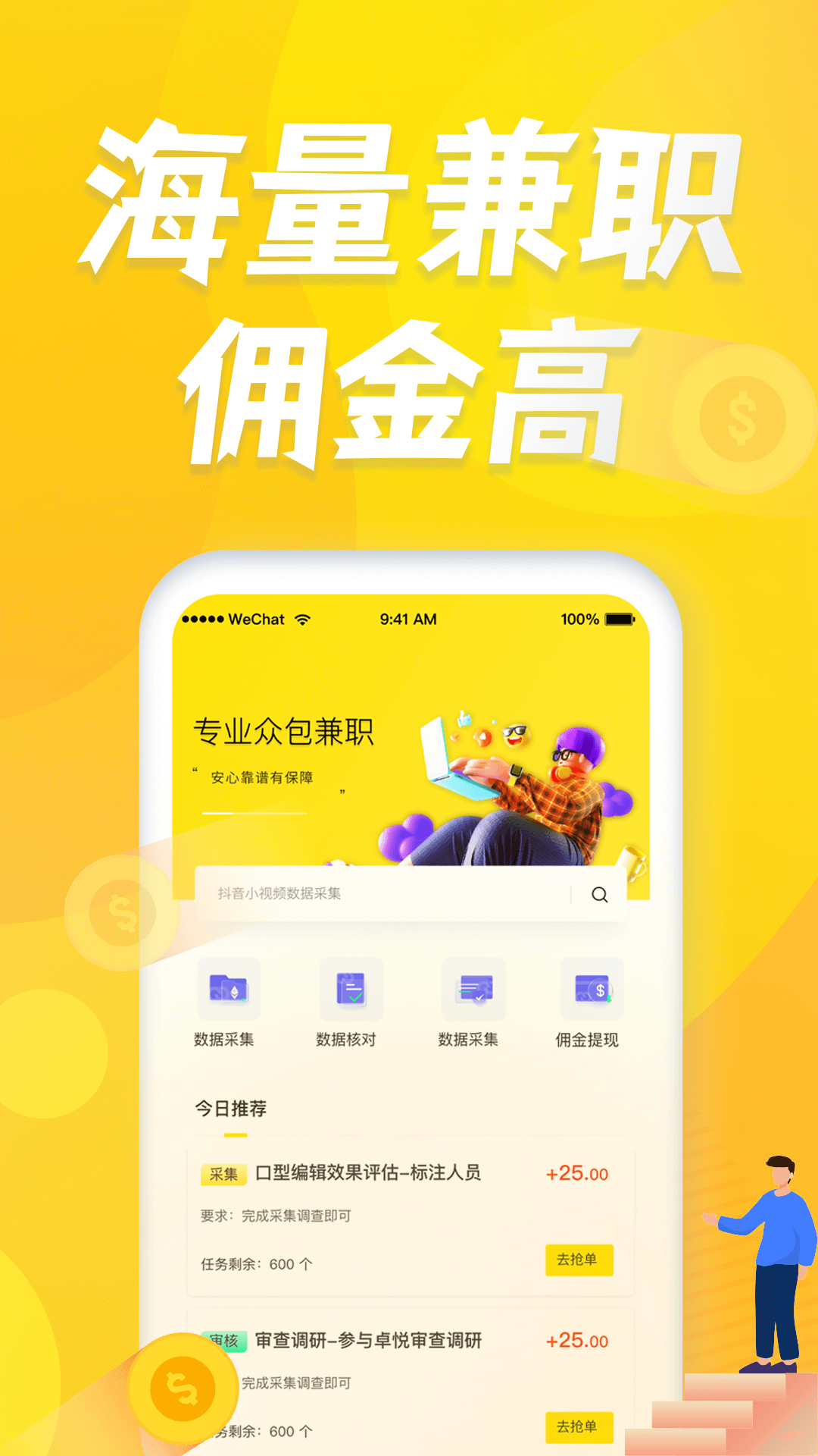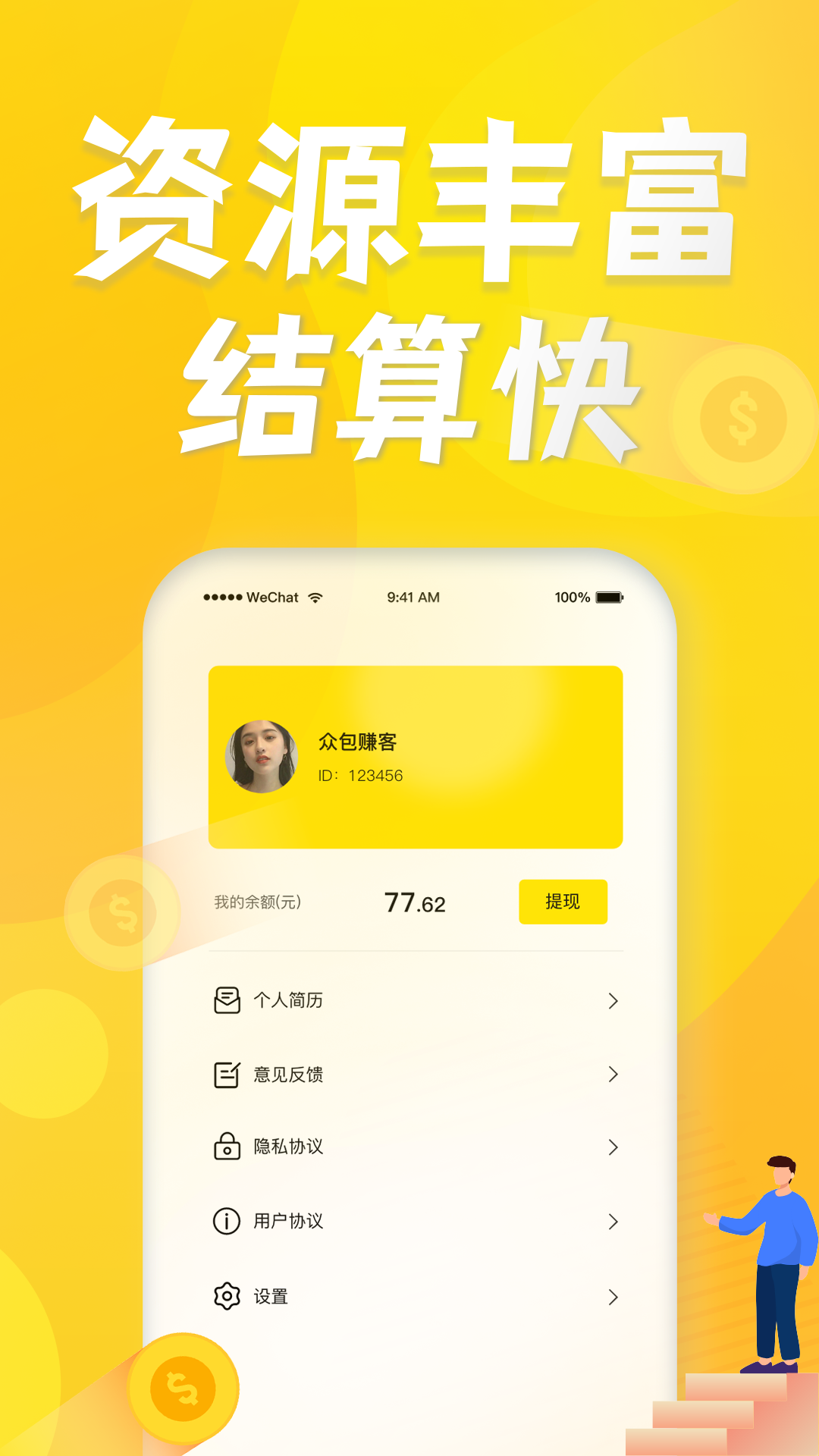 众包赚客app是一款专注于兼职信息整合的移动应用平台,为用户提供丰富的线上兼职机会和线下灵活用工岗位。平台严格审核各类任务信息,确保真实可靠,让用户能够根据自身需求灵活选择适合的赚钱方式。