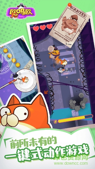 欧呜欧是一款搞怪2d动作游戏。玩家扮演两只因意外牵连在一起的喵和汪,一同踏上了营救铲屎官的奇妙之旅。集各种骚操作于一键(贱),于旋转中把握前进的时机,最终战胜强敌找到主人!