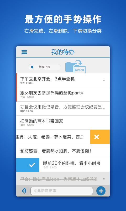 -左滑删除记事,右滑将记事标记为已完成