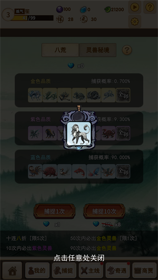 玩家们点击捕捉即可前往游戏内的地图中进行捕捉灵兽,游戏里有着超多的灵兽可以捕捉,每一个灵兽都有属于自己的技能和故事背景特色,十分帅气;