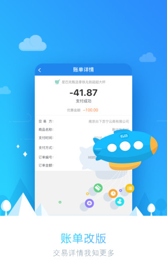 便民支付:支持账户间转账、转账到银行卡、信用卡还款、话费充值、水电煤固话宽带缴费、一卡通充值,便捷贴心;