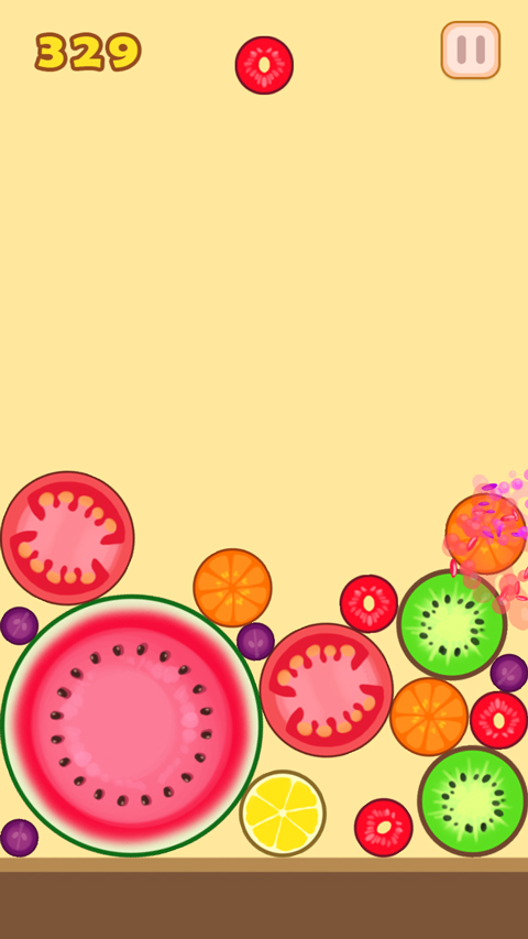 相同水果接触后合成更高级水果,最终目标是合成大西瓜(2048玩法);