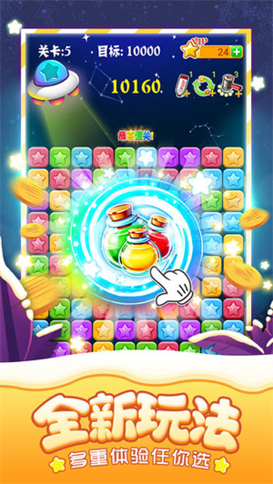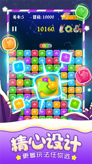 【玩法经典】点击两个或更多相同的星星可消除;【时间充足】没有时间限制,每关消灭星星达到目标分数即可过关;