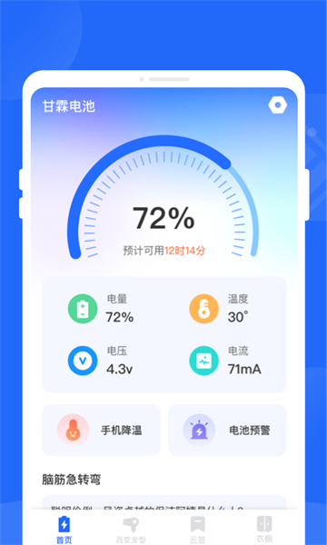 电池监控:甘霖电池App可以实时监控电池使用情况,显示剩余电量、电池温度等参数,让用户随时了解电池状态。