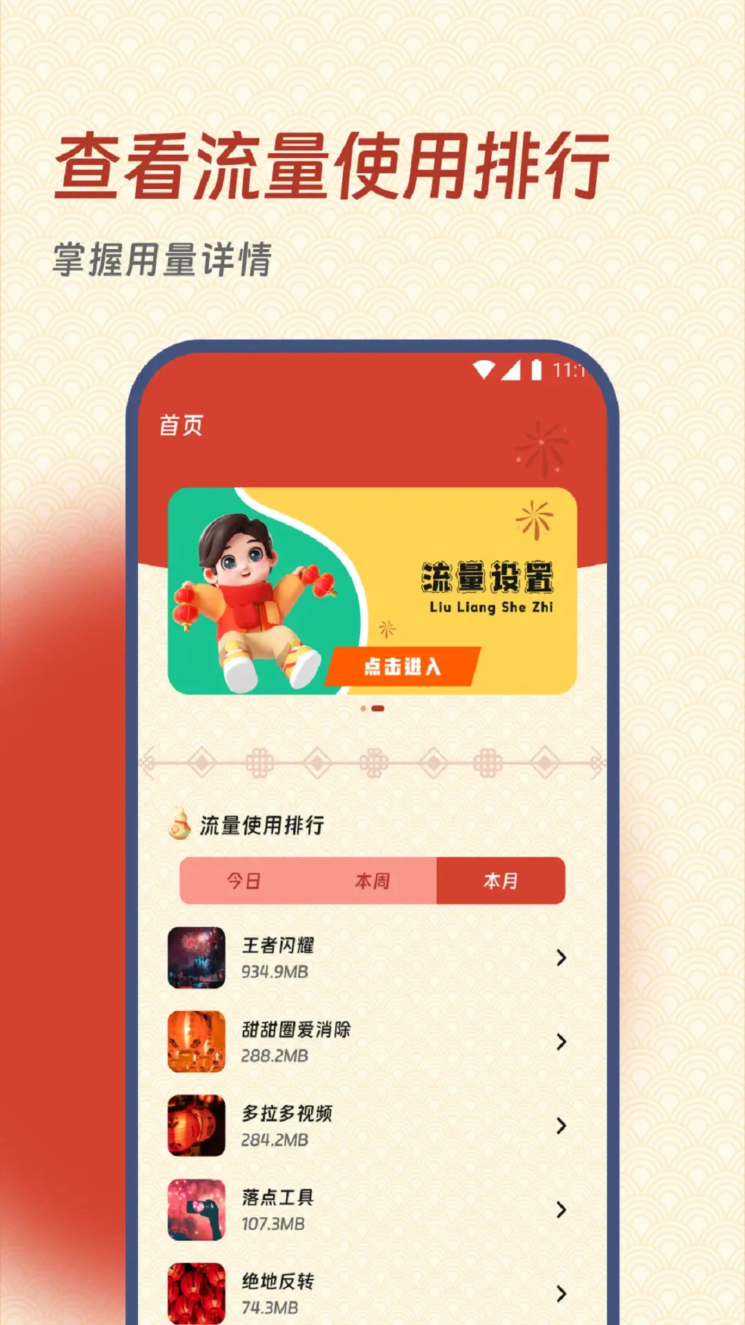流量使用排行:实时监测并展示各应用的流量消耗情况,帮助用户快速识别高流量应用。