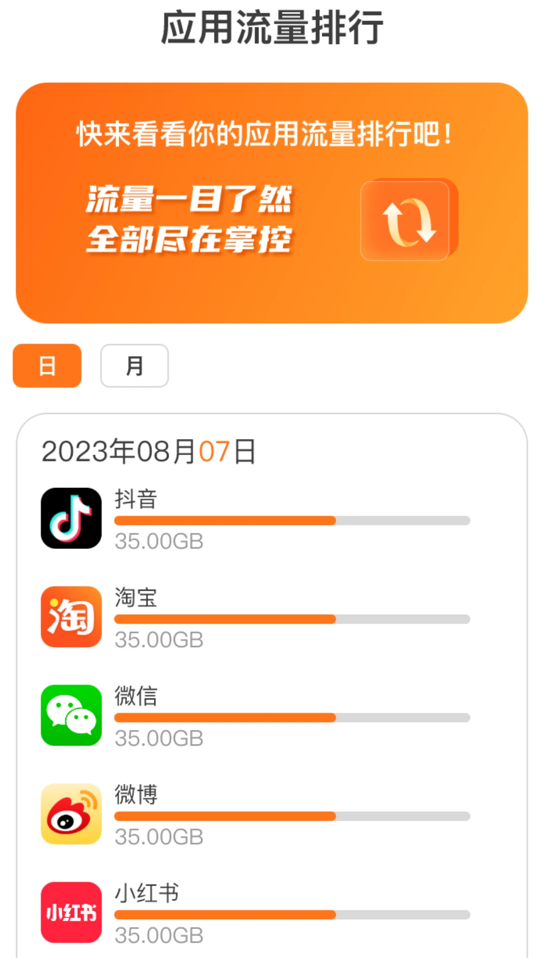 流量应用排行:实时监测并分析各应用的流量消耗,生成详细排行榜,帮助用户快速识别高流量消耗应用。