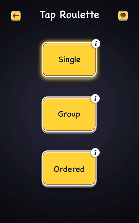 游戏以轮盘玩法为核心,设有简单、组队和指令三种难度模式,需要逐步解锁才能体验。除了经典的轮盘玩法外,TapRoulette还集成了抛硬币、掷骰子、比大小等多种小游戏,玩法丰富多样,绝对能让喜欢聚会游戏的玩家爱不释手。