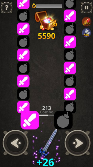 这款游戏的核心玩法以点击操作为主,类似于传统音乐节奏游戏。玩家需要准确点击带有"剑"标志的彩色图标来累积连击数,但要避免误触"地雷"图标,否则会中断连击并缩短游戏时间。