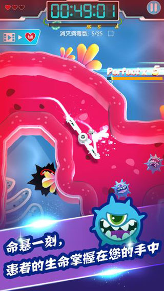 游戏设计了丰富的章节关卡,并创新性地加入了科研培养系统。玩家可以升级手术刀的生命值、回血速度、攻击强度、移动速度和切割范围等属性,还能解锁多种手术刀外观。在紧凑的游戏节奏中,玩家需要争分夺秒地与病毒展开激烈对抗。据悉,该系列续作《病毒大作战B计划》已在开发中,值得玩家期待。