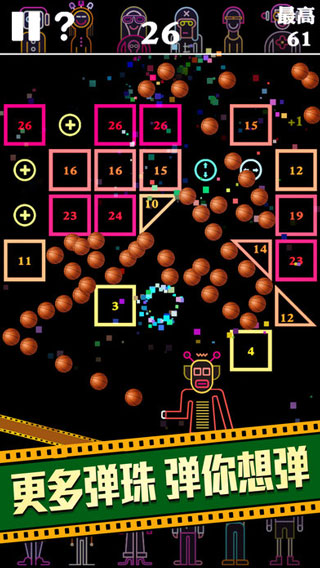 游戏内提供了四种道具,加号可以让下一回合的小球数加1,双向箭头可以让整行或整列的砖块数字减一,三向箭头可以分散小球,让小球从不同方向反弹出去,金币则是摇球需要。其中,三向箭头道具要多多利用,它可以让小球四散分开,形成"大乱斗"局面,一次性消除多个砖块,眼花缭乱,摆好姿势射出来,看着非常爽。加号的小球也要尽量击中,增加下一回合的小球。
