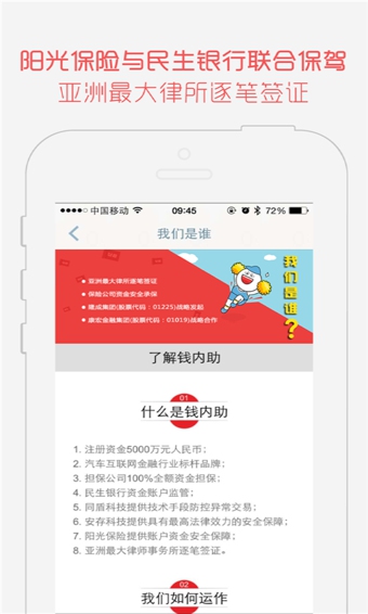 钱内助与康宏集团(股票代码:01019)等多家金融机构建立战略合作关系;平台旗下包含钱贝勒、垫贷宝、押车宝三大核心理财产品,致力于打造专业、安全、透明的互联网理财服务平台。