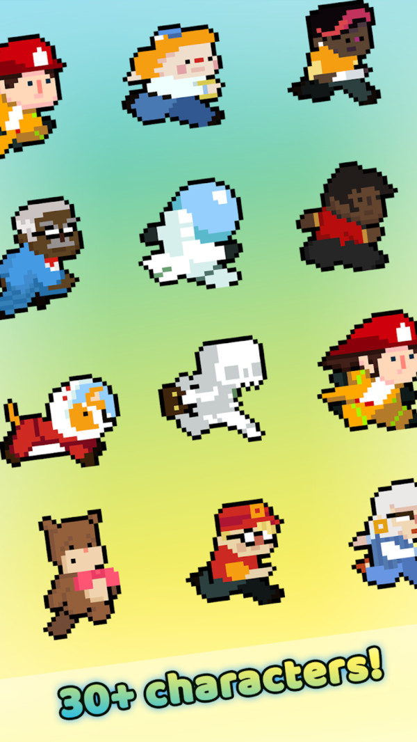 游戏采用的像素人物,玩家在各式变化的场景中进行奔跑,躲避沿途的机关陷阱,收集道具,使用降落伞从高楼安全落下,有趣的城市奔跑游戏。