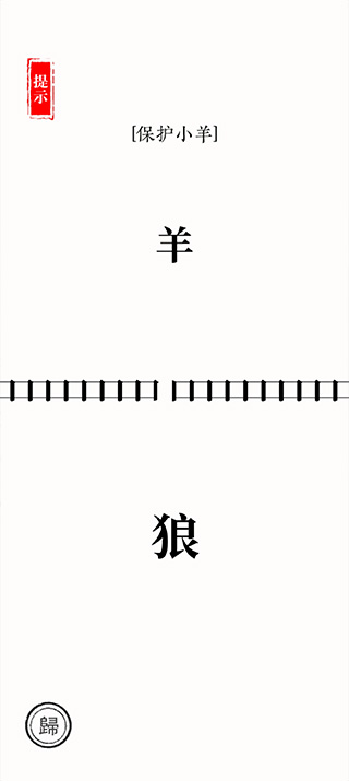 将图中的羊字,移动到题目羊上面,然后获得咩,将咩移动到狼上,然后狼吃掉了羊,就剩下一个口字,口可以用来补掉栅栏缺失的部分。