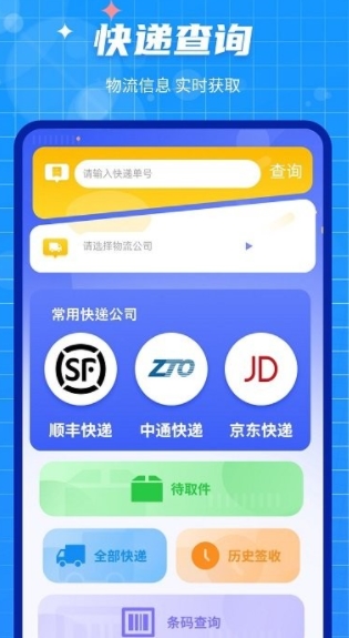 信息实时获取,支持顺丰,中通,等常用的快递查询,效率高也简洁,历史签收功能可同步保留,方便查看,对条码查询有很好的优化结果。