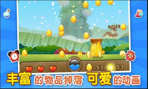 接住金蛋可以获得金币奖励,用来解锁各种精美皮肤。游戏考验玩家的反应能力,需要同时兼顾接取金蛋和道具,还要避开各种障碍。画面风格活泼可爱,充满童趣,特别适合小朋友游玩,丰富的内容让游戏极具可玩性。
