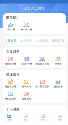会计工具箱是财务会计人员的专属应用,提供简洁实用的会计计算工具与查询工具,同时包含专业的财会领域资讯阅读功能,致力于打造财会人员的掌上工作平台。
