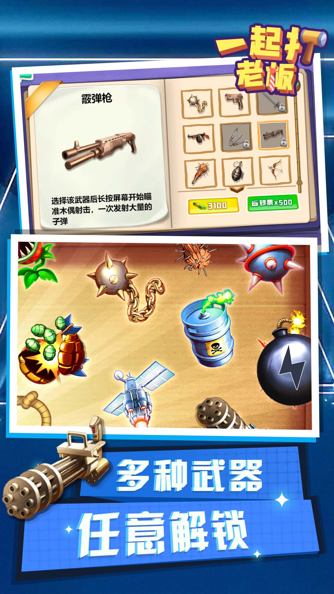 《一起打老板》是一款以解压为核心的休闲游戏,玩家可以操控可爱的木偶人进行各种暴打操作,使用丰富多样的武器道具来释放压力。游戏通过逼真的物理模拟和趣味玩法,让玩家在轻松愉快的氛围中完成解压挑战。