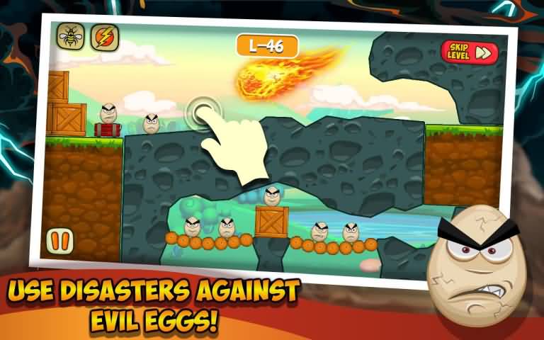 游戏“灾难将打击2”-在Android上的一个令人上瘾的益智游戏,你的任务是摧毁每个级别的邪恶蛋。在这个游戏中,你可以从各种灾难,自然灾害和其他有助于破坏卵子的物体获得帮助。