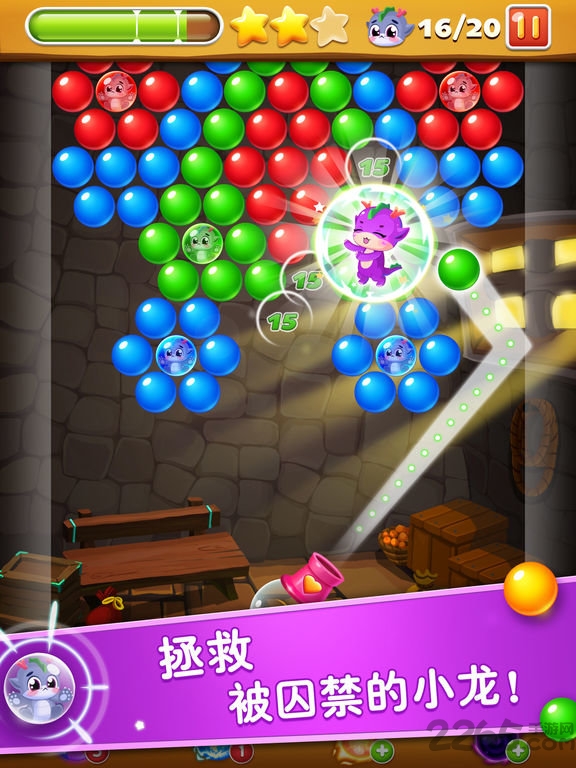 ·游戏中的玩法非常的简单,玩家需要按照三消的游戏玩法将关卡中的大量泡泡全部消除掉,取得游戏的胜利