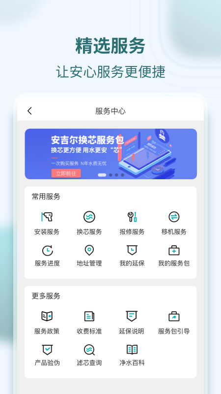 服务中心:安装维修预约、工单查询、延保服务、净水知识