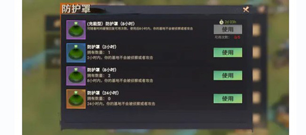 2、目前保护罩种类分为二小时、八小时以及二四小时。除此之外,随着时间推移,系统会帮我们累计免费的保护罩次数,在避难所资源多但暂时用不完的情况下,可以考虑“开罩”。