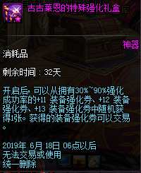 古古莱恩的特殊强化礼盒,开启后可以从拥有30%到90%强化成功率的+11装备强强化券、+12装备强化券、+13装备强化券当中随机获取到1张,获得的装备强化卷可以进行交易。