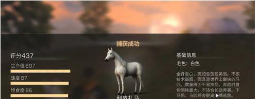 白色的野马数量最少,但移动速度是最快的,当然也是最漂亮的,白马的刷新率比较低,主要分布在红杉镇位置,目前没有固定的刷新点,小编在护卫队北边稻田找到过,想要的玩家多去寻找,一般在晚上遇到的概率高点!