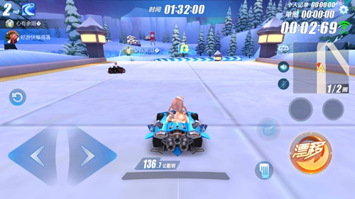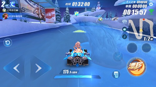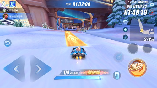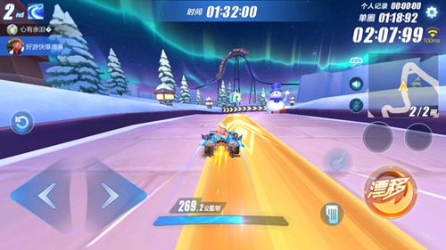 第一个弯道之后,在赛道中间会出现加速带,我们要尽可能的使用加速带来提升我们的速度。同时前方也会出现新的180度掉头弯道。