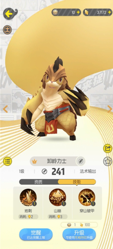 在穿山甲没有完全觉醒前,可以用来挑战试炼任务,守卫擂台不推荐,属性容易被针对。