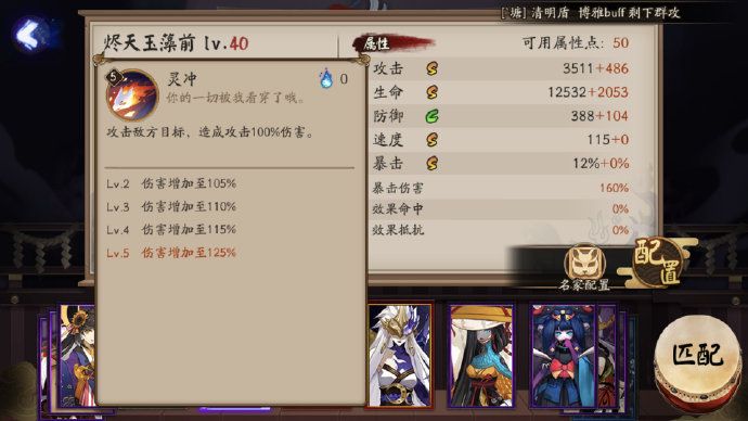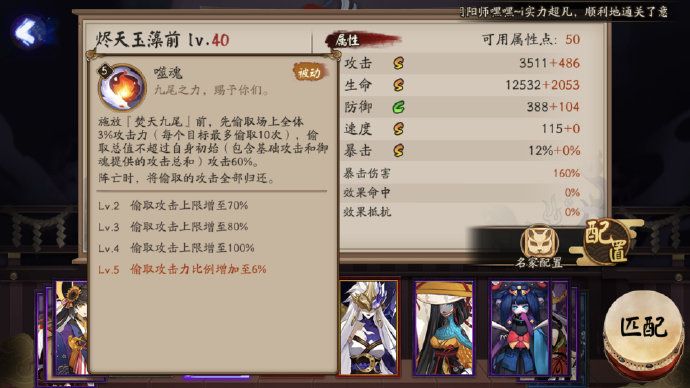 施放「焚天九尾」前,先偷取场上全体3%攻击力(每个目标最多输取10次),价取总值不超过自身初始攻击60%(包含基础攻击和御魂提供的攻击总和)。