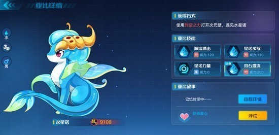 亚比技能:顺流抓击、星诺水纹、星诺力量、穿石激流。
