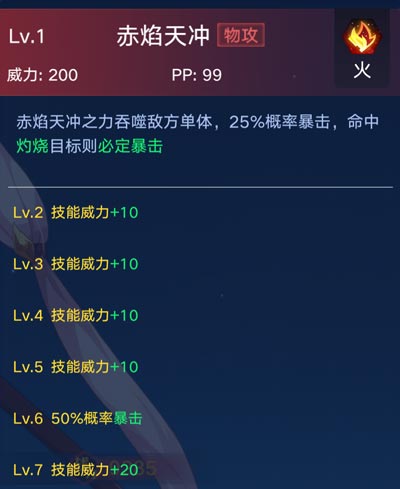 4、赤焰冲天:赤焰天冲之力吞噬敌方单体,25%概率暴击,命中烧伤目标则必定暴击。