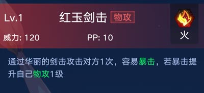 3、红玉剑击:通过华丽的剑击攻击对方1次,容易暴击,若暴击提升自己物攻1级;
