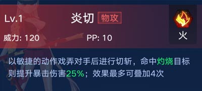 1、炎切:以敏捷的动作戏弄对手后进行切斩,命中烧伤目标则提升暴击伤害25%;