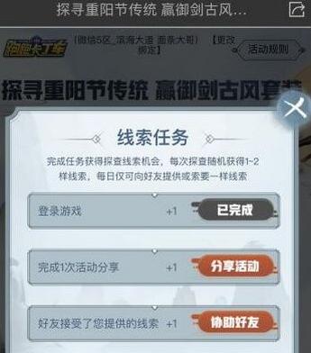 前两个任务都非常简单,而后两个任务需要好友的配合,难度也非常低,只要每日游戏的时候顺手点一下就可以轻松获得全部线索了。五个牌子所需要的线索有所不同,但是只要将每日线索任务都完成,想要领取重阳节套装就非常简单。