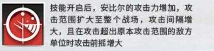 二技能:技能开启后,安比卡的攻击力增加,攻击范围扩大到整个战场,攻击间隔增大,而且攻击超出原本攻击范围的敌方单位的时候攻击前摇增加。
