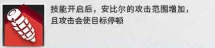 一技能:技能开启后,安比卡的攻击范围增加,而且攻击会让目标停顿。