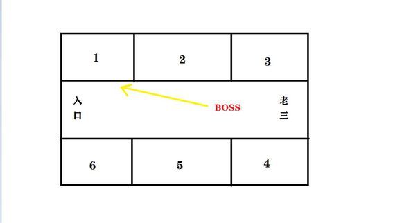BOSS行走顺序如下,其中5号牢房已经有一个NPC在啦,奶妈必定在一号牢房,之后按照123456顺序走动。